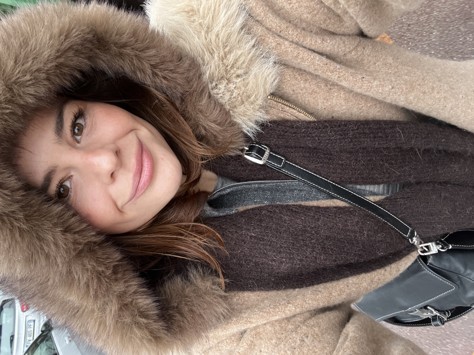 A female individual is depicted in a close-up, chest-up selfie, looking directly into the camera with a subtle smile. She has brown eyes and light brown hair partially visible. She is wearing a textured, light beige or tan coat featuring a prominent hood lined with brown fur, which transitions to a lighter beige on its outer edge. Beneath the coat, a dark brown textured scarf or garment is visible, layered over a grey zippered top. A black shoulder bag with a silver buckle and white stitching on its strap is worn, with the strap positioned across her front. The blurred background shows a silver vehicle with a visible French license plate "FW-465-PF", alongside a grey structure and paved ground. The scene is located outdoors, within the city of Rueil-Malmaison, France.