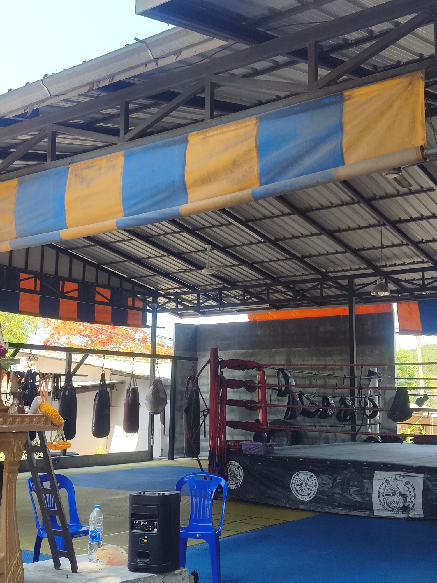 This is an interior view of a Muay Thai training gym located in บ้านบางรักษ์, Thailand. The scene features a boxing ring with red ropes and black corner posts positioned in the mid-right, its dark canvas skirt displaying white circular "Muay Thai Gym" logos. Various pieces of training equipment, including multiple black, maroon, and beige punching bags, hang from a horizontal bar in the mid-left to background. Above the ring ropes, several pairs of boxing gloves and focus mitts are suspended. The floor is covered with interlocking blue and yellow/beige mats. In the foreground-left, an altar-like structure, possibly a spirit house, adorned with a yellow floral garland, stands next to a small wooden ladder. Two blue plastic chairs are present, one near the altar and another further right. A black portable speaker and a clear plastic water bottle are placed on a light-colored surface in the foreground. The gym operates under an open-sided structure with a corrugated metal roof supported by dark metal trusses, from which hang ceiling fans and a single lamp fixture. A large, weathered fabric banner with blue and yellow horizontal stripes hangs below the roof structure in the upper frame, and additional orange and blue banners are visible towards the rear. The area is illuminated by natural daylight, and no individuals are present.