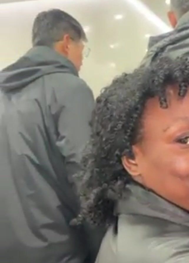 A woman with short curly black hair is riding an escalator. She is wearing a black puffer jacket. She turns to the camera and makes faces, pouting and sticking out her tongue. The escalator is crowded with people, all wearing winter coats. A man with glasses is in front of her, and another man with a gray hooded jacket is behind her. The environment appears to be inside a modern building, possibly a shopping mall or transportation hub.