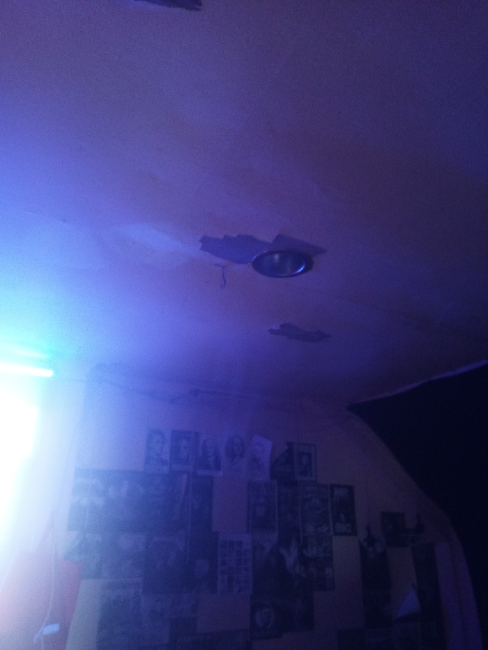 A dimly lit room reveals a textured ceiling with recessed lighting and visible damage patches. A collection of posters adorns the wall. A black object partially obstructs the right side of the view. The light source casts a blue hue, making it difficult to discern finer details.