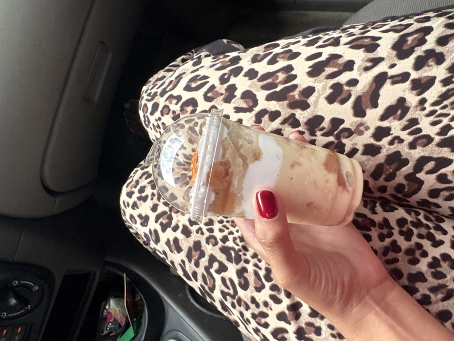 A human hand with red nail polish holds a clear plastic cup containing a layered beverage or dessert inside a vehicle. The cup features a light brown liquid layer at the bottom, a white creamy middle layer, and a lighter brown solid or crumbly layer on top, all covered by a clear dome lid with orange-colored sprinkles. The hand belongs to an individual whose legs are visible, clad in leopard print patterned clothing. The background reveals portions of a dark vehicle interior, including a dashboard with circular air vents, a glove compartment, and miscellaneous items in a dashboard storage crevice. The scene occurs within a vehicle, at an unspecified location within Altagracia, Venezuela.