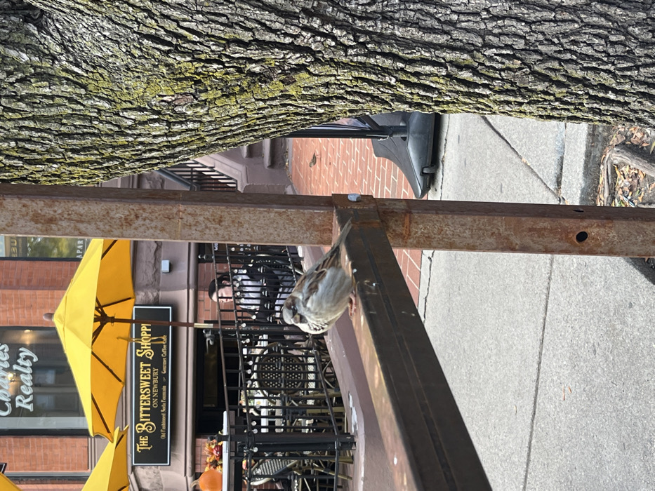 - "An urban street scene on Newbury Street in Boston, Massachusetts, features a house sparrow perched prominently on a rusted, horizontal metal barrier in the foreground" by FM-WegpJ2, licensed under CC BY 4.0