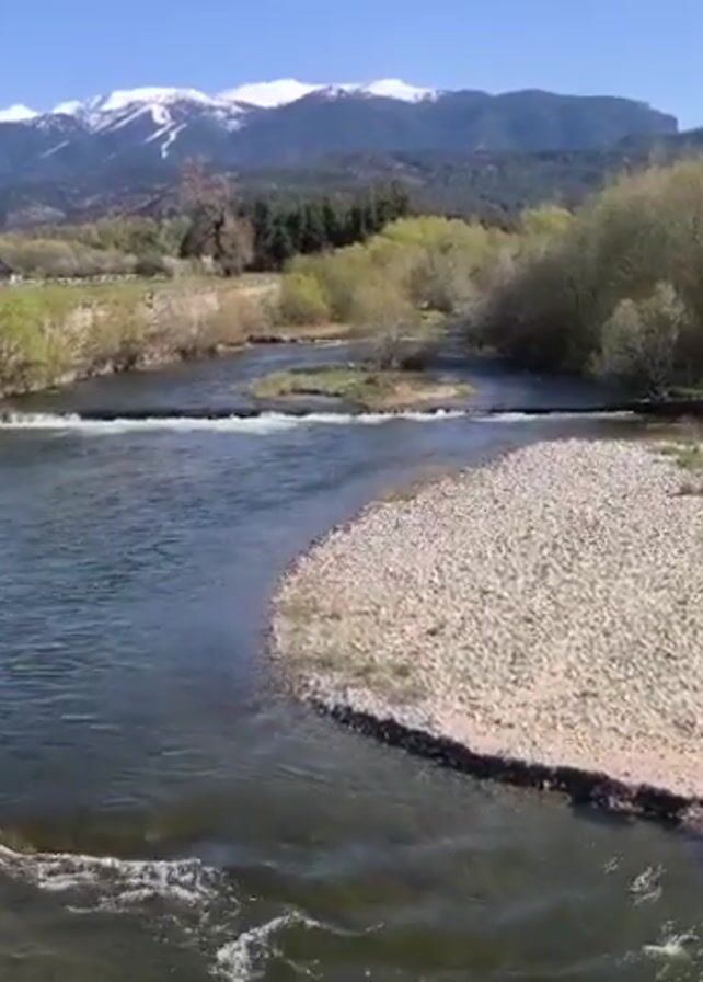The camera pans slowly over a river in a scenic landscape on a sunny day. The river has a small waterfall created by a low dam. A small, sandy island sits in the middle of the river. Beyond the river, a stone wall lines the bank, and sparse vegetation can be seen. In the distance, a row of snow-capped mountains is visible against a clear blue sky. Some houses are visible amongst the trees and hills.