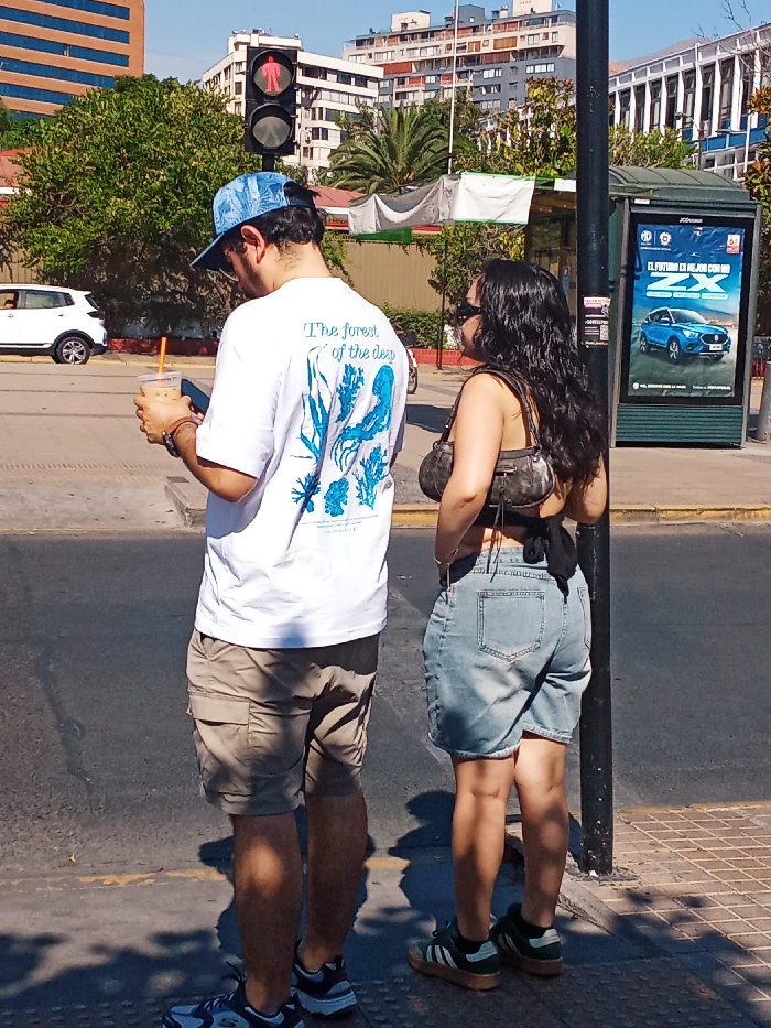 Two people are standing at a crosswalk with a 'do not walk' signal. A man is holding a coffee and looking at his phone while wearing a white t-shirt, khaki shorts, and a blue hat. A woman with curly hair is wearing sunglasses, a crop top, and a light blue denim skirt. A bus stop with an advertisement is visible to the right. In the background, there are buildings and trees.