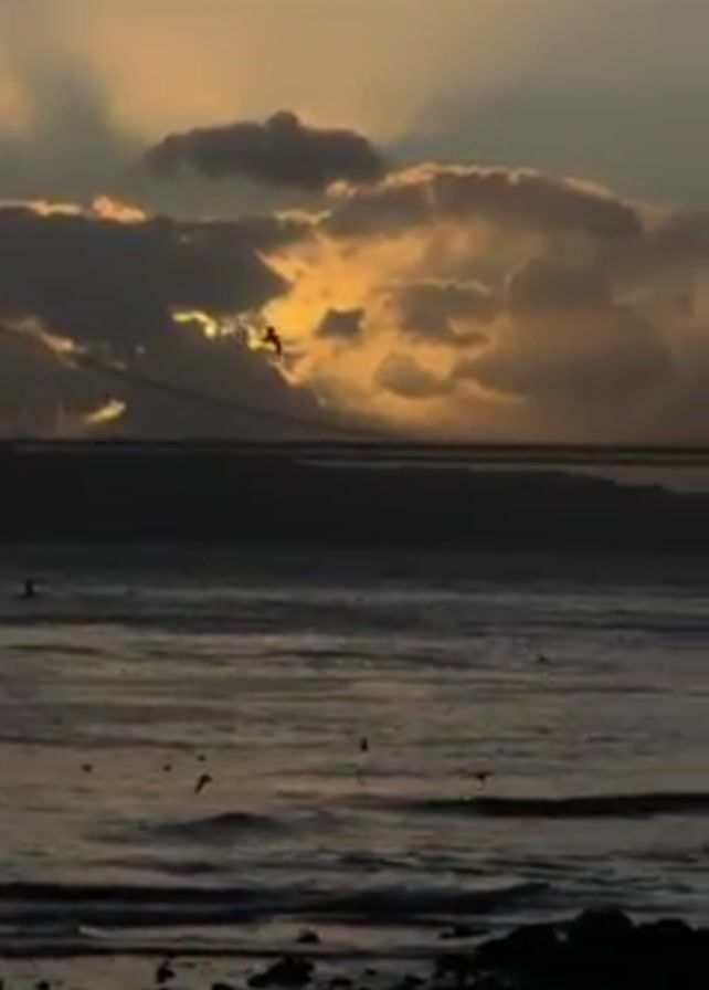 silhouette of a bridge under a sky with golden sun rays breaking through the clouds. The water is dark with small waves, and several birds fly around. The camera moves down to reveal a person standing on a rocky shore looking out at the water, their figure silhouetted against the light. The birds continue to fly around near the shore.
