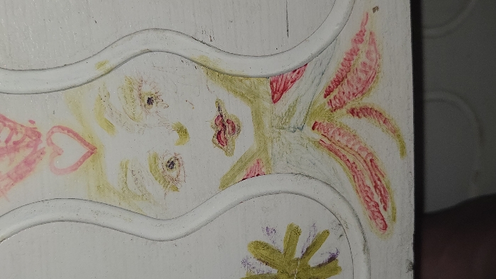 - "The image displays a close-up, vertical view of an abstracted, stylized humanoid figure drawn in a crayon-like medium on a textured white surface, possibly a decorative panel or piece of furniture, situated in Lompoc, United States" by FM-0J88a2, licensed under CC BY 4.0