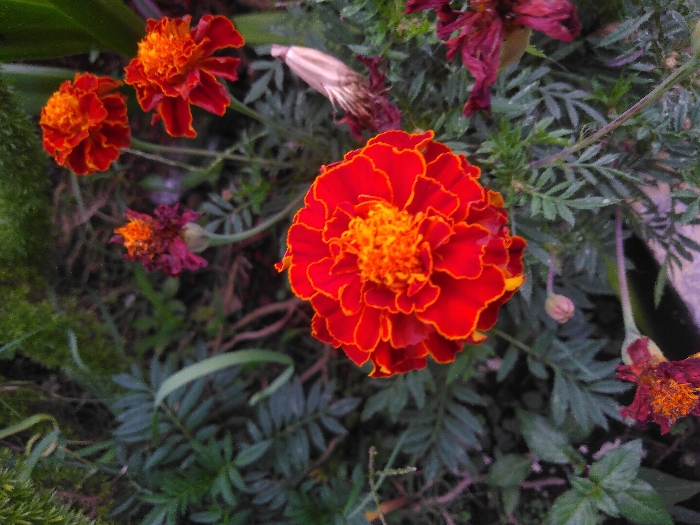 The image displays a detailed, top-down view of several marigold flowers and assorted green foliage, situated in Santa Rita, Venezuela. The central subject is a large, vibrantly colored marigold, approximately 10-12 cm in diameter, exhibiting deep red petals with pronounced orange margins and a compact, textured orange center. To the upper right, three smaller, less defined marigold blossoms are visible, also featuring red and orange hues, appearing slightly out of focus. Adjacent to the main bloom, to its upper left, is a partially withered marigold with dark red-purple petals and a visible orange center. Another withered, dark red floral remnant is present in the lower right. A single, closed flower bud is located beneath the primary marigold. The flowers are surrounded by a dense array of green leaves, including the finely divided foliage characteristic of marigolds, and other broader green plant matter. A dried, light-colored plant component or petal is situated to the right of the upper cluster of flowers. The background is softly blurred, revealing additional green vegetation and hints of moss. No human subjects or discernible actions are present.