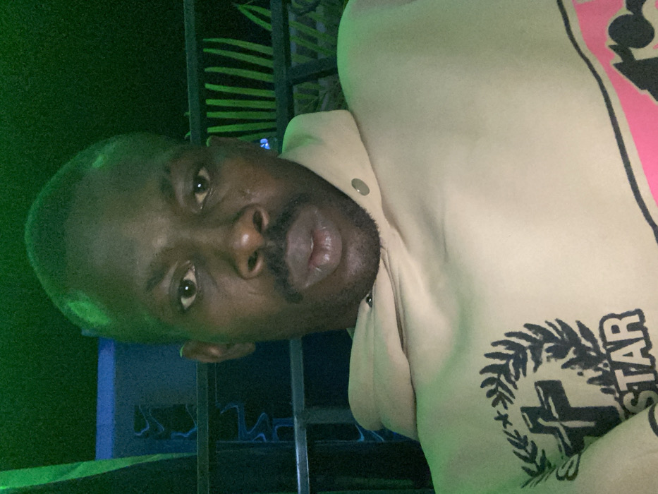 A man with short hair and a mustache is facing the camera. He is wearing a tan-colored hooded sweatshirt with black and pink graphics on the right side. He appears to be outdoors at night. Green light is visible on the left side of the image. A metal railing and leafy plants are in the background.