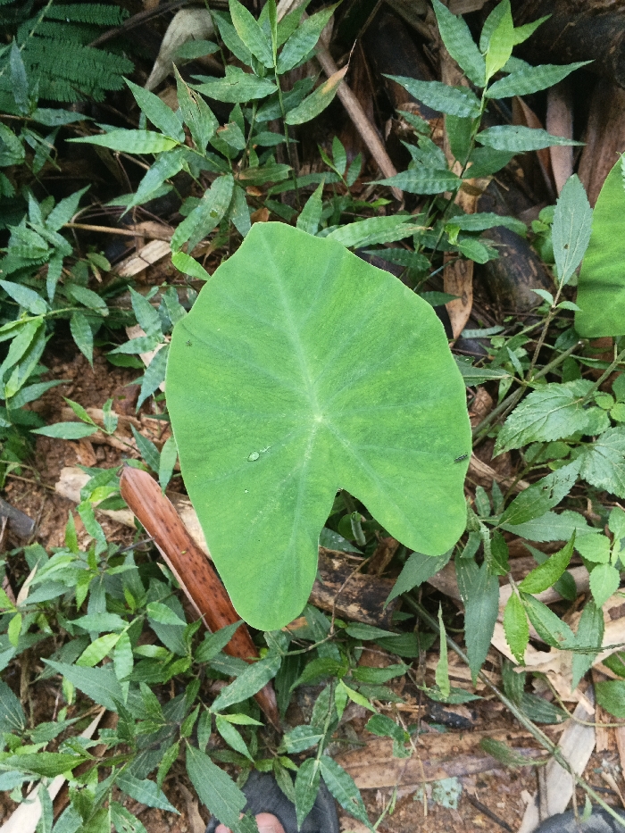 An overhead photograph depicts dense ground-level vegetation in Butwal, Nepal. A vibrant green, cordate-shaped leaf, approximately 25 cm in width, is prominently centered. A single clear water droplet rests on its surface, slightly left of the central vein, and a small, dark-colored insect is present on its upper right margin. The large leaf is surrounded by a variety of smaller green plants, including narrow-bladed grasses and broader-leafed herbaceous growth, creating a dense ground cover. The visible ground consists of reddish-brown soil interspersed with dried leaves and fragmented plant matter, including sections of what appear to be bamboo stalks. A reddish-brown, elongated, cylindrical object, approximately 18 cm long, is partially visible beneath the large leaf and to its left, nestled within the surrounding foliage. The tip of a human left foot, clad in a dark-colored open-toed sandal, is visible in the bottom-left corner of the frame, partially obscured by vegetation.
