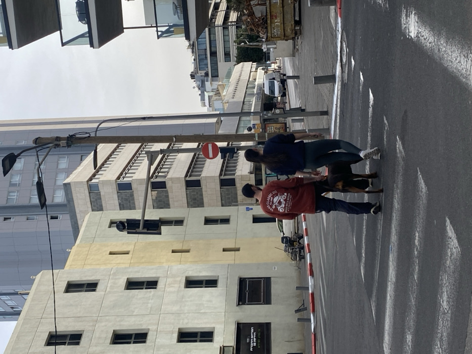 - "A man and a woman are walking a dog on a city street" by FM-ED1xR2, licensed under CC BY 4.0