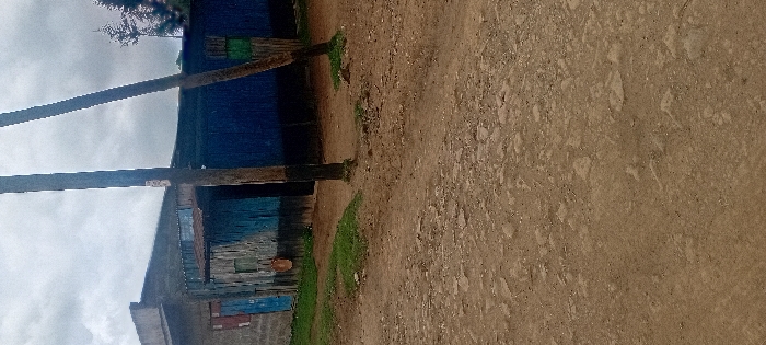 The image displays a static scene in Unknown, Kenya, under an overcast sky. The foreground consists of an unpaved, light brown dirt surface, appearing uneven with scattered small stones and patches of exposed aggregate. In the midground, two weathered wooden utility poles stand. The pole on the left has a small, light-colored rectangular adhesive label approximately two-thirds up its shaft and a black painted band encircling its base. The pole on the right leans slightly towards the right and also exhibits a black painted band at its base. Behind these poles, a single-story building extends across the frame. The left section of the building is constructed from grey concrete blocks, with a flat roofline. This section features a vertical blue wooden door or shutter on its far left and an adjacent, narrower green-brown wooden panel or shutter. A circular, light brown object is affixed to the block wall between these two panels. The central and right sections of the building are clad with corrugated metal sheeting, predominantly painted dark blue. A section of vertical, weathered light brown wooden planks is visible between the concrete block structure and the main blue corrugated section, partially covered by a small, rusted corrugated metal canopy. Patches of green grass are observed at the bases of the utility poles and along the building's foundation. The background reveals a densely overcast sky with uniform grey clouds. On the far right, dark green foliage, consistent with conifer trees, is partially visible, suggesting a vegetated area beyond the structures. No individuals, vehicles, or animate objects are present or engaged in any activity.