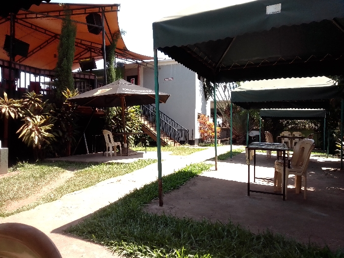 The image depicts an unoccupied outdoor leisure or dining area in Sagana, Kenya, under bright daylight conditions