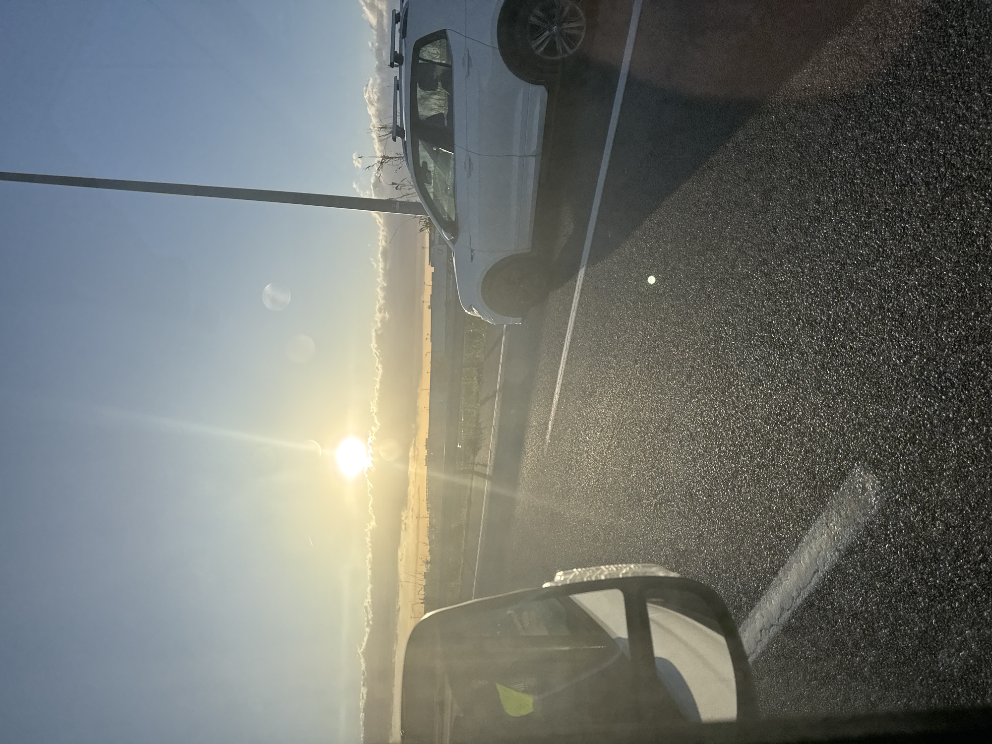 The image depicts a roadside scene at sunset or sunrise in the city of Sant Boi de Llobregat, Spain. The sun, a bright circular disk, is low on the horizon, centrally positioned in the upper portion of the frame, emitting strong light rays and causing lens flare artifacts. The sky transitions from a bright yellow-orange at the horizon to a pale blue at the top, with scattered cumulus clouds along the lower sky. A faint crescent moon is visible in the upper right quadrant, above the sun. In the immediate foreground, to the left, is the dark, partially visible exterior rearview mirror of a vehicle from which the photograph was taken. A segment of a white dashed road line is visible on the dark, granular asphalt pavement beneath the mirror. In the mid-ground, a white compact SUV, possibly a Volkswagen T-Roc, is positioned to the right of the frame, oriented slightly leftward. It features dark roof rails. To the right of the SUV, a tall, slender dark utility pole extends vertically from the ground towards the sky. Beyond the asphalt road, a low concrete barrier separates the road from a strip of uncultivated land containing dry, reedy vegetation. The background shows a distant industrial landscape along the horizon line, characterized by multiple dark silhouettes of cranes and building structures, indicative of a port or industrial complex. No individuals are clearly visible in the scene. The overall lighting suggests either early morning or late afternoon conditions.