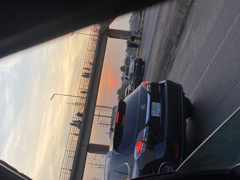The image depicts a street scene in Kuchingoro, Nigeria, at sunset. A prominent reddish-orange sun is visible low in the sky, positioned beneath the left span of an elevated pedestrian bridge. The perspective is from inside a vehicle, with portions of the car's interior obscuring the top left and bottom right corners of the frame. In the left foreground, the rear of a black Lexus RX 350 SUV is visible, its taillights illuminated. The vehicle displays a Nigerian license plate "RSH-702FW" from Abuja, Federal Capital Territory. The road ahead shows additional vehicle traffic, including a dark sedan and a white van. An elevated pedestrian bridge spans horizontally across the middle ground, constructed of concrete supports and metal railings. Approximately twelve human figures are silhouetted against the sky, walking across the bridge from left to right. Two modern streetlights are visible, one on the bridge and another to its right. On the right side of the road, beyond the bridge support, a group of approximately five individuals is standing on or near the shoulder. In the background, power lines and utility poles are present on the left, and distant buildings are partially visible under a hazy sky on the right. The sky transitions from warm orange and yellow tones near the horizon to a paler blue-grey above.