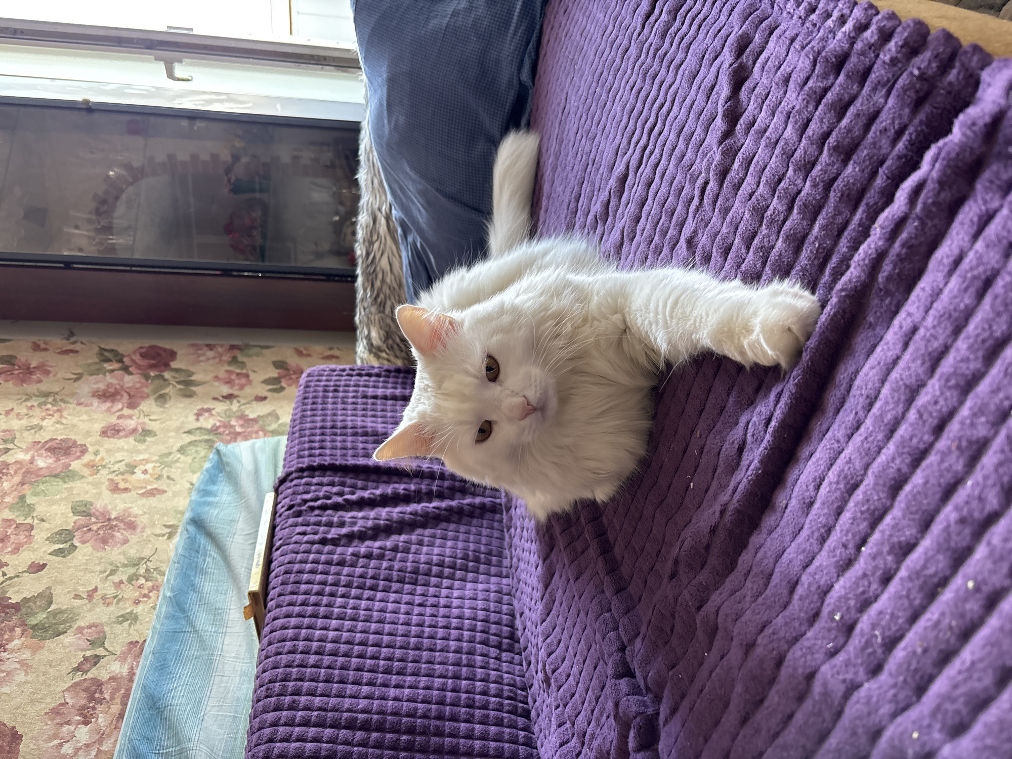 The image depicts an indoor scene, likely a residential interior. A long-haired white cat with amber eyes is the central subject, lying prone on a textured purple fabric cover, possibly a sofa or bed throw. The cat's front right paw is extended forward, and its gaze is directed towards the viewer. To the left of the cat, a wall is covered with floral wallpaper featuring a pattern of large pink roses and green foliage on a light, possibly beige, background. Above the purple cover, a light blue fabric, potentially striped, is draped over a piece of furniture, and a small, light-colored book is resting on its top edge. To the right of the cat, a dark-colored display cabinet with glass doors is visible, containing indistinct items such as glassware and decorative objects. Adjacent to the cabinet on the far right is a white-framed window or balcony door, admitting natural light into the room. A dark blue fabric cover and a brown-and-cream textured fabric are visible on the furniture to the right of the cat. The exact location within the city of Minsk, Belarus, cannot be determined from the visual evidence presented in the image. No human subjects are present in the scene.