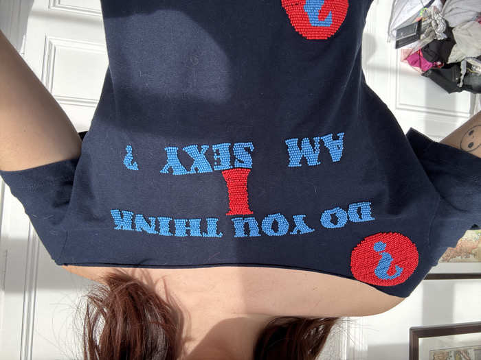 The image depicts an indoor scene with a person photographed from the chest up. The specific location within Barcelona, Spain, is not discernible from the visual evidence. The person has reddish-brown hair and is wearing a dark blue, off-the-shoulder t-shirt. The t-shirt is embellished with beadwork: - A large red circular patch containing a blue question mark is located on the left shoulder/chest area. - The text "DO YOU THINK I AM SEXY ?" is spelled out across the chest. The words "DO YOU THINK" and "AM SEXY ?" are rendered in light blue beads, while the letter "I" in "THINK I AM" is rendered in red beads. - A second, partially visible red circular patch with a blue question mark is located at the lower right of the t-shirt. - A black and white Yin and Yang symbol tattoo is visible on the inner left forearm. The background consists of a light-colored wall with framed artwork hanging on it, partially visible in the upper left. A white door or wall panel with vertical molding is visible on the right and in the lower left background. Natural sunlight streams into the scene, illuminating the subject and background from the right, creating shadows. In the lower left, behind the person's arm, a basket or container holds various items, including clothing, indicating a lived-in environment.