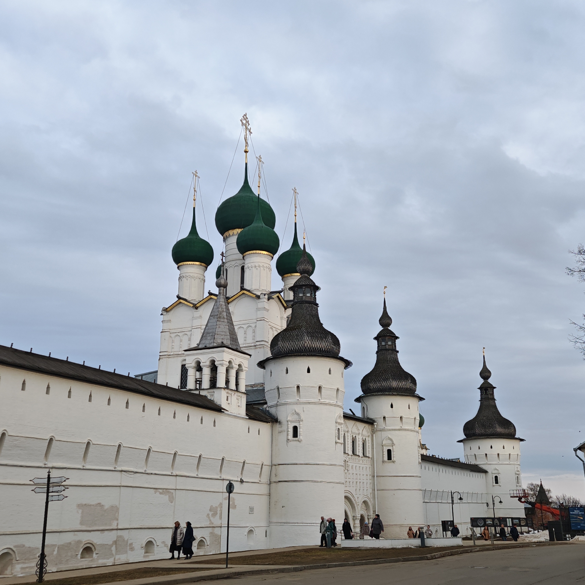 The image depicts a large, white-walled architectural complex under an overcast sky in Ново-Никольское, Russia. The scene is dominated by a historical fortified monastery or kremlin structure, its high, white-washed walls extending across the midground. These walls are topped with a dark, sloped roof and feature crenellated or decorative elements. Several distinct towers rise from the walls; these are round, white, and capped with dark, shingled, conical, or onion-shaped roofs, some adorned with small golden finials. A prominent central church within the complex displays five or more dark green onion domes, each topped with a golden Orthodox cross, indicating its religious significance. Intricate white architectural details and golden trim are visible on this central church structure. A grey-roofed bell tower with arched openings is visible to the left of the main church. An arched entranceway is visible on the right side of the complex's facade, with several individuals approaching or standing near it. In the foreground, a paved asphalt road runs horizontally, bordered by a dirt and patchy grass verge and a concrete sidewalk. Patches of residual snow are visible on the ground, suggesting a cool season. A black, ornate street signpost with multiple blank directional arms stands on the far left of the sidewalk. Several individuals are present on the sidewalk, walking or standing, dressed in winter coats and jackets. Two individuals walk from left to right in the near foreground. Towards the right, informational boards or display panels are visible along the sidewalk. Beyond the complex, sparse, bare tree branches extend into the frame on the right, and a red scissor lift or crane is partially visible behind the walls. The sky is uniformly light grey, densely overcast, filling the upper half of the frame.