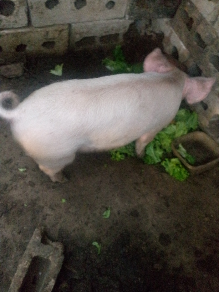 - "The scene, located in the city of Las Guevaras, Venezuela, depicts a pinkish-white pig standing on dark, damp ground within an enclosure" by FM-Q5qB73, licensed under CC BY 4.0