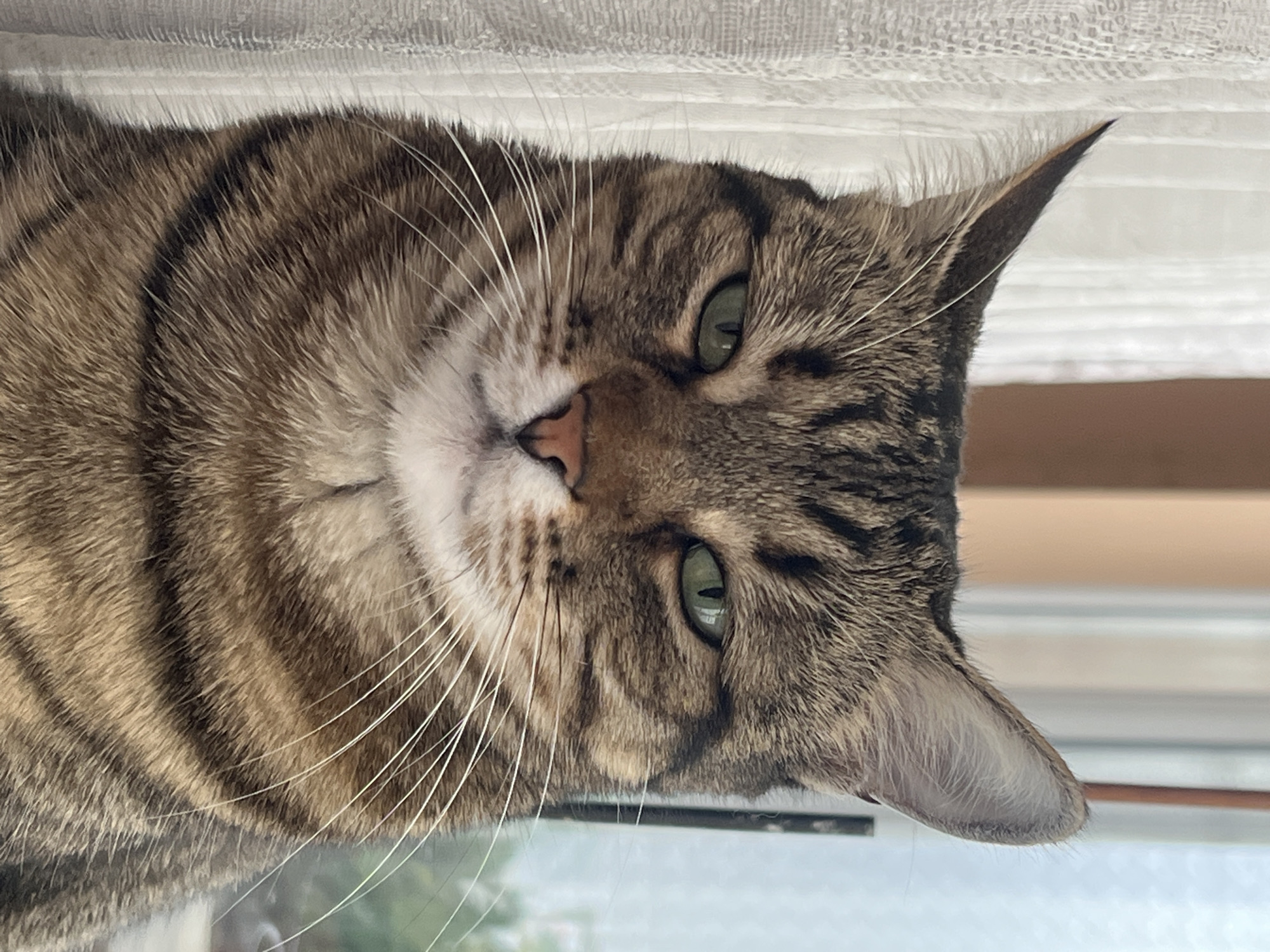 An upright, frontal photographic capture depicts a domestic tabby cat. The animal presents a fur coat with brown, black, and tan stripes. Its eyes are green and appear partially constricted. A pink nasal planum is central, flanked by numerous prominent white vibrissae. Both ears are erect; the left ear (viewer's left) terminates in a distinct, dark tuft. The background consists of a white, semi-transparent, textured curtain on the left, and a blurred exterior scene featuring light blue and green elements, visible through a window, on the right. This scene is situated in Karnobat, Bulgaria.