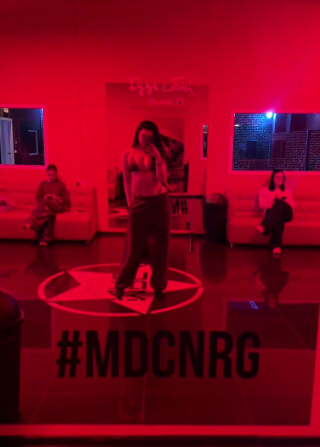 A woman takes a selfie in a red-lit waiting room. She is wearing a bikini top and loose pants. There are two couches with people sitting on them on either side of the room. A trash can is in the background. A logo on the floor says "#MDCNRG." A sign above the mirror says "Будь собой."