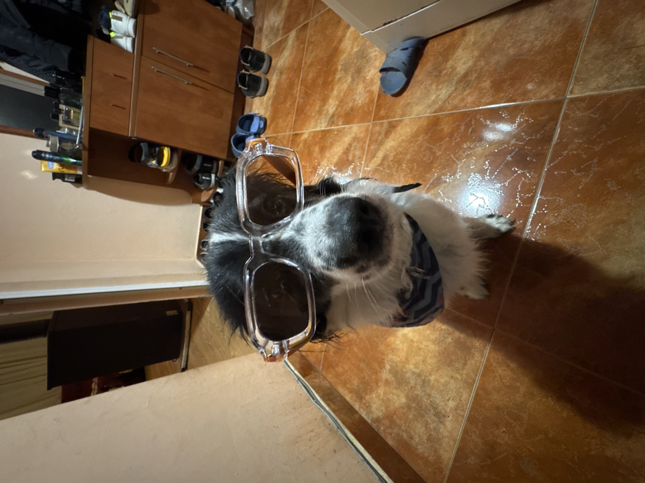 This image depicts an indoor scene within the city of Tsarevo, Bulgaria. A black and white dog, resembling a Border Collie, is positioned centrally, looking directly at the viewer. The dog is wearing clear-framed sunglasses with dark lenses and a blue and white chevron-patterned bandana around its neck. Its fur appears damp, and numerous water droplets are visible on the glossy, reddish-brown tiled floor surrounding it. To the left, a partial view of an open doorway reveals a darker room with a large, dark rectangular object. To the right, a wooden shoe cabinet with open shelves holds several pairs of shoes. The top surface of this cabinet displays various bottles and containers, including what appear to be perfumes and hygiene products. Additional footwear, specifically a pair of blue slides and a pair of dark shoes, rests on the tiled floor near the cabinet. A single blue sandal is partially visible in the immediate foreground to the right, adjacent to a white box. The lighting casts a pronounced shadow of the dog onto the floor.