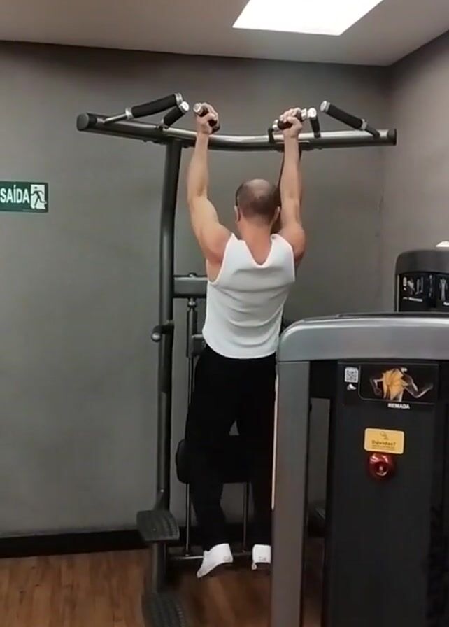 In a brightly lit gym, a man is using a pull-up assist machine. He is wearing a white tank top, black pants, and white shoes. The machine is metallic grey. The man stands on the machine's footrests and grips the handles overhead. He pulls himself up, assisted by the machine. To the side of the machine is another piece of exercise equipment, also metallic grey. The gym has a gray wall with a green "SAÍDA" exit sign. The floor is a wood-like laminate. The scene is static, with the camera focused on the man and the machine.