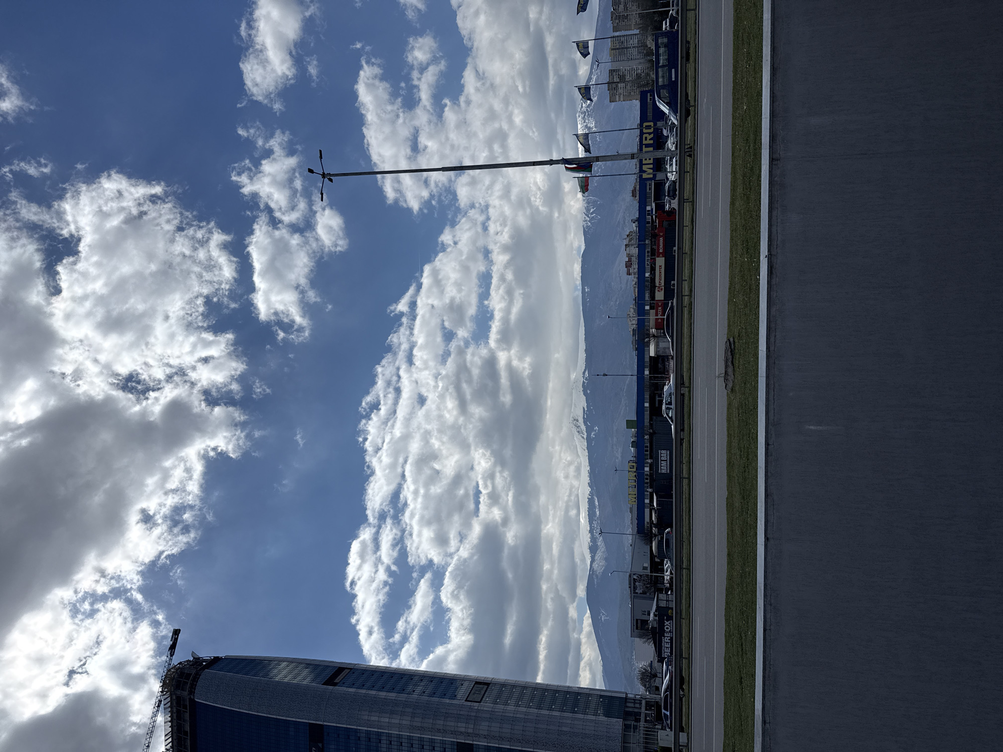 street scene in Sofia, Bulgaria, with a view of the Vitosha Mountains in the background. On the right side of the image is a road and a grassy area bordering a large building complex, identified by signage as a "Metro" wholesale store and other commercial establishments, including "Pizza Romania" and "Epizzenter". The mountain range is visible between the building complex and the road. In the foreground on the left side, the top of a tall skyscraper under construction is visible, featuring scaffolding. Above, the sky is mostly blue with scattered cumulus clouds. A streetlight stretches across the sky from the road. The image is taken during daylight.