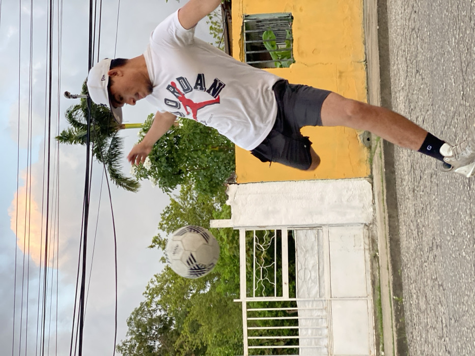 - "A young man in a white shirt and cap juggles a soccer ball on a street" by FM-SP1IA3, licensed under CC BY 4.0