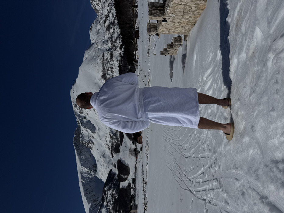A male individual stands facing away from the viewer, looking towards snow-covered mountains in Motički gaj, Montenegro. He is dressed in a white terrycloth bathrobe, tied at the waist, with his bare lower legs and light-colored slip-on sandals visible. His hands are positioned behind his back. The foreground and midground consist of a snow-covered field marked with numerous tracks. To the right, a low stone wall with multiple dark fixtures extends into the snowy landscape. In the distant midground, scattered small buildings and dark trees are visible. The background is dominated by a range of large, snow-capped mountains under a clear, deep blue sky.