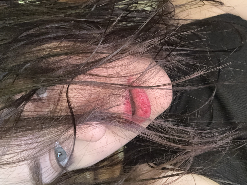This close-up photographic portrait, captured in Toksovo, Russia, features a single individual, appearing to be female, facing directly towards the viewer. Her dark brown hair, appearing wet or disheveled, falls across much of her face, obscuring the right eye and parts of the forehead and nose. The left eye, with a light blue iris, is clearly visible and fixed on the observer. Her lips are slightly parted and coated with vibrant red lipstick. The lower portion of the image shows the upper chest and neck clothed in a black, ribbed, high-neck garment. The background is indistinct and out of focus, providing no specific environmental details.