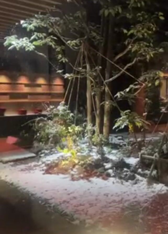 Japanese garden covered in snow at night. A light in the garden illuminates the snow and highlights the branches of a tree that is secured with rope. In the background, a wall with shelves containing red objects is visible. Snow is falling. Someone laughs in the background and says something in Japanese.