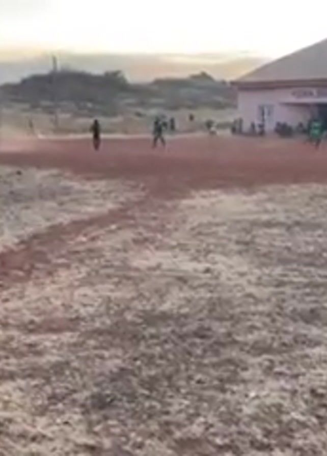 soccer game in progress on a dry, dusty field. Several players wearing green jerseys are on the field, with one player standing to the left of the frame. Other figures can be seen in the distance. In the background, there's a building with the words "KEEMA GOSPEL CHURCH" written on it. The sky is visible and appears to be during sunset or sunrise.