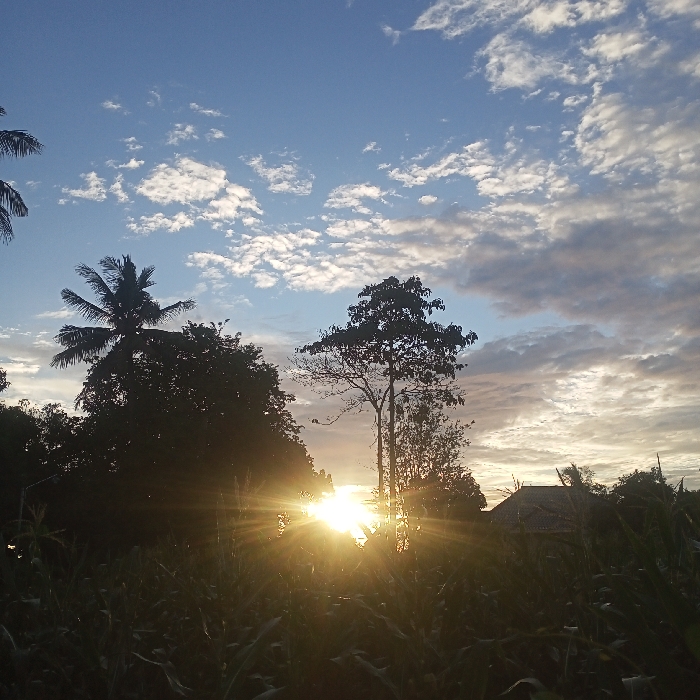A vibrant sunrise illuminates a rural landscape. Silhouetted trees and crops frame a brilliant sunburst, creating a dramatic interplay of light and shadow. Above, a blue sky is patterned with fluffy white clouds. A glimpse of a thatched roof building is visible amongst the foliage. The scene evokes a sense of tranquility and the beauty of nature.