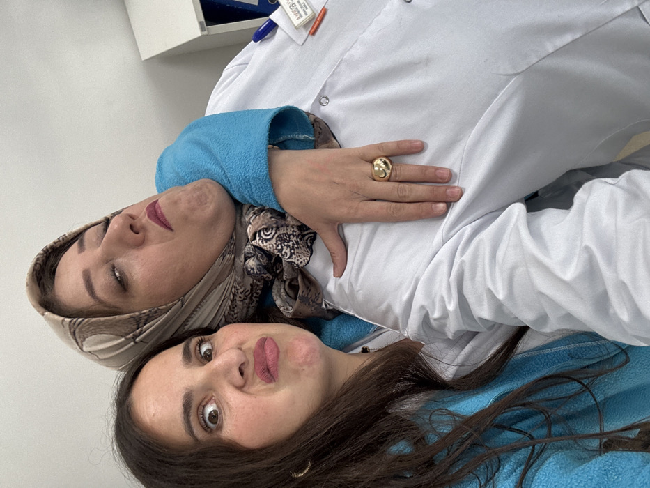The scene depicts two adult females indoors, likely within a medical or office facility in Meknes, Morocco