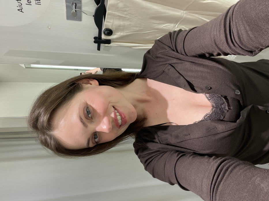 A female subject is depicted in a contemporary fitting room located in the city of Pompei, Italy. The subject, appearing to be in her 20s or 30s with long brown hair, is shown from the chest up, smiling directly at the camera, which is reflected in a mirror to her left, indicating a self-portrait. She wears a dark brown long-sleeved button-down cardigan over a dark brown, lace-trimmed camisole. The environment consists of light-colored walls, with a large mirror occupying the left side of the frame and a clothing rack with a black hanger holding a light-colored garment (possibly pants or a skirt) on the right. Partially visible Italian text is present on the upper right wall.