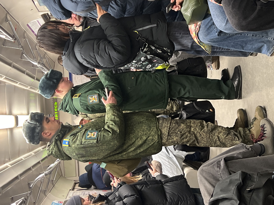 In a crowded subway car, two soldiers in winter gear stand among civilians