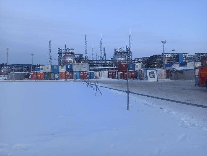The image captures an industrial complex in Yukhta, Russia, under overcast, twilight conditions, characterized by extensive snow coverage. The foreground consists of a large, undisturbed snowfield, with a cleared, partially snow-covered path extending from the lower right towards the middle left. A solitary metal pole stands vertically in the snow to the left of this path, alongside three metal anti-vehicle obstacles (Czech hedgehogs) partially embedded in the snow. In the midground, a continuous line of modular container structures, colored white, red, and blue, are stacked one to two units high, many featuring small windows. Behind these structures, a large industrial facility is visible, comprising numerous interconnected metal towers, extensive piping, scaffolding, and large storage vessels, including a prominent spherical, reflective tank on the left side. Artificial lighting emanates from various points within the complex. The front section and cab of an orange heavy-duty truck are partially visible on the far right, while a white vehicle is partially obscured in the far left background. No individuals are present in the scene.