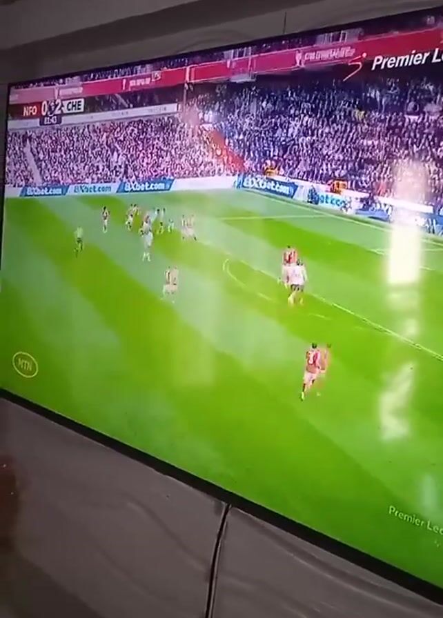 A television displays a live soccer match between Nottingham Forest and Chelsea