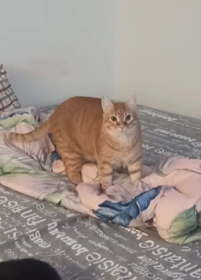 An eye-level, static shot shows an orange tabby cat standing on a bed