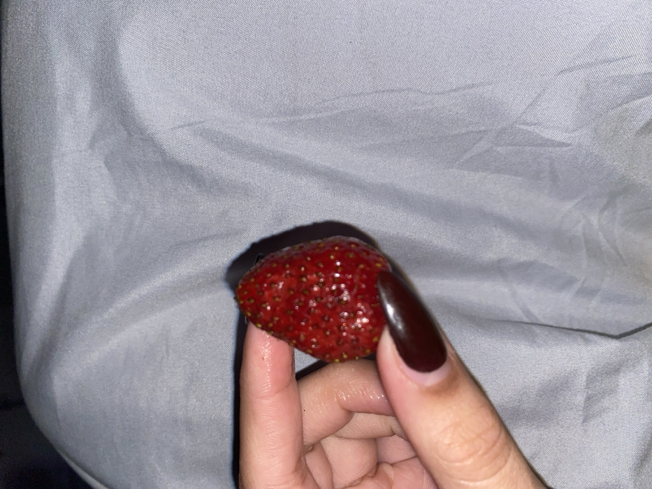 - "A human left hand, with long, almond-shaped fingernails painted a dark maroon color, grips a single, ripe, red strawberry" by FM-a3sBJ3, licensed under CC BY 4.0