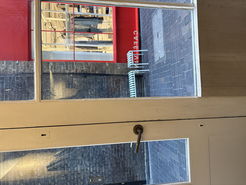 The image depicts an outdoor urban scene observed through a white-framed glass door or window. In the immediate foreground, a white door panel with an aged brass lever handle and a lower keyhole plate is visible on the left. The bottom right of the frame shows light wooden paneling. Beyond the glass, a narrow, cobbled street is present. To the left, a dark brick wall features a grey rectangular electronic intercom panel. To the right, a building displays a vibrant red-painted facade on its ground level. This red facade incorporates a large display window, also framed in red, revealing white shelving or racks inside, laden with clothing items such as shirts, jackets, and bags, indicative of a retail clothing store. Reflected prominently in this window, in reversed white lettering, is the text "CAFE VIVS." On the cobbled ground directly in front of the red facade, two modern, white slatted metal benches or stools are positioned. No individuals are present, and no actions or interactions are depicted. The environment, characterized by cobbled streets, brick architecture, and boutique storefronts, is consistent with Ganton Street, London W1, located within the City of Westminster, United Kingdom.
