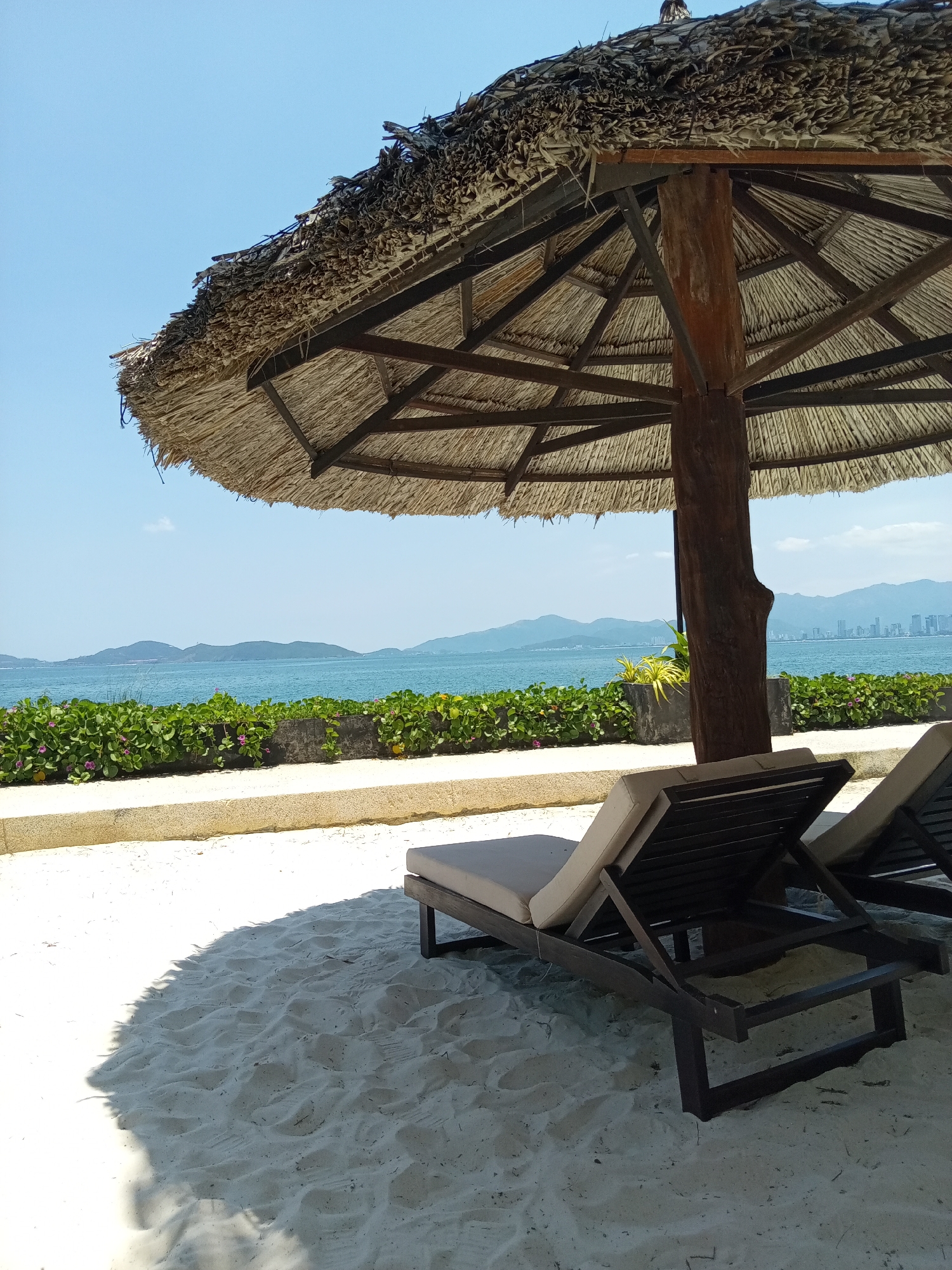 The image depicts a beach scene in Bac Natural Heritage Area Trang, Vietnam. Two wooden beach loungers are positioned under a thatched-roof umbrella on a sandy area. In the background, a body of water is visible, with islands or mountains in the distance, and a coastal city skyline to the right. A low concrete wall with green vegetation separates the sand from the water's edge. The sky is clear and blue.