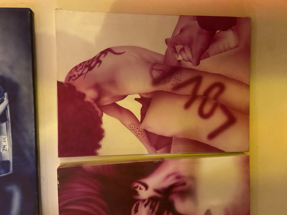 Two adjacent canvases display artistic expressions. The upper canvas shows a person with dark, curly hair and tribal tattoos on their back and arm. The body is intertwined with hands. The word "LOVE" is superimposed on the image. Below, the second canvas shows a close-up of a person's face with soft, blurred details. The dominant colors are shades of pink and white, creating a surreal and intimate feel. Another canvas with a car is visible to the left.