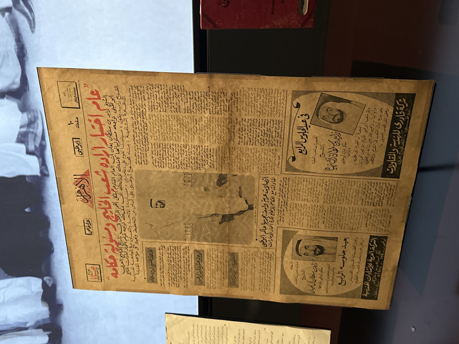 - "An aged Arabic newspaper, identified as Al-Ahram with "Abu Dhabi" indicated, stands vertically on a dark, reflective display surface, likely located within Qasr Al Hosn in Abu Dhabi, United Arab Emirates" by FM-IkaP23, licensed under CC BY 4.0