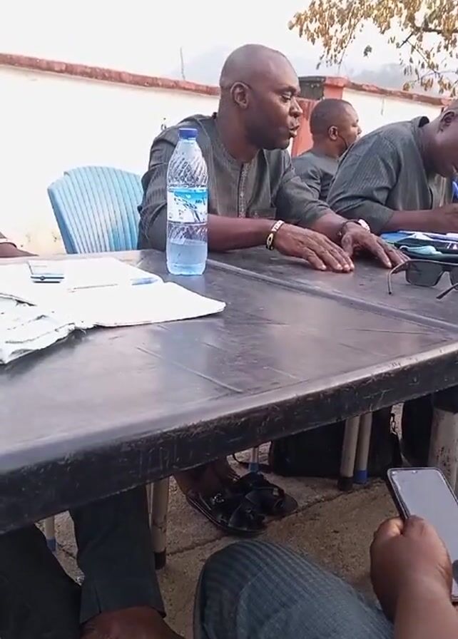 group of men at an outdoor meeting. There are three men seated at a black table, with a fourth person recording the scene. The man at the head of the table is speaking and gesturing with his hands. He has a bald head and is wearing a dark long-sleeved shirt. There is a bottle of water on the table in front of him. The men on either side of him are writing in notebooks. The person recording is holding a smartphone. The man in the foreground is also wearing a dark outfit and sandals. The meeting appears to be taking place outdoors, with a white wall and trees in the background.
