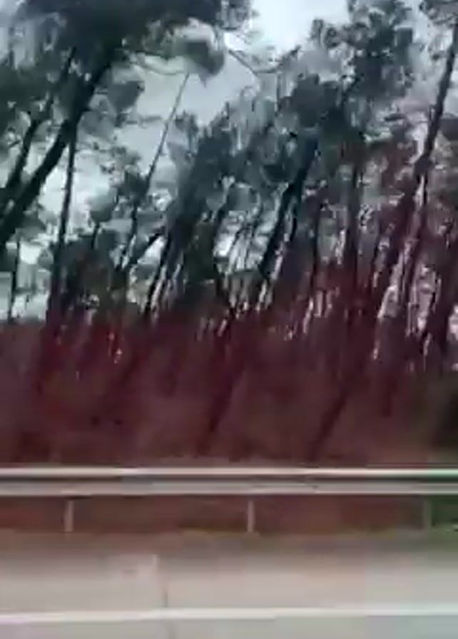 view from a car window, driving along a highway. A line of dense, dark trees, bent by the wind, lines the side of the road. The sky is overcast and grey. A silver car passes on the road beside the car with the camera.
