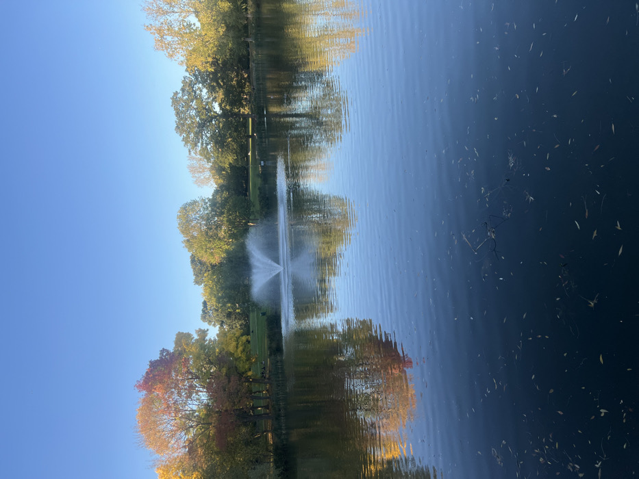 The image displays a daylight scene of the main lake within Castle Park, Colchester, United Kingdom. A fountain actively propels water vertically from the lake's surface, positioned towards the left of the frame's horizontal center. The far bank of the lake is lined with deciduous trees exhibiting autumn foliage in shades of red, orange, yellow, and green. The water's surface reflects the clear blue sky and the surrounding trees. Several small, indistinct human figures are present on the grassy bank in the mid-ground, beneath the trees. The foreground water contains scattered organic debris and ripples. A small white sign with dark text is partially visible at the water's edge on the far bank, to the right of the fountain. The sky above is clear and cloudless.
