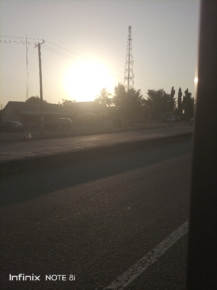 An eye-level shot captures a tranquil scene with a road prominently featured in the foreground. A white line marks the edge of the road, leading to a sunlit backdrop. Buildings, trees, and a tall communication tower are visible, partially obscured by the bright sun. A person is visible on the sidewalk. The image, taken with an Infinix Note 8i, exhibits a warm, slightly hazy atmosphere, suggesting either sunrise or sunset.