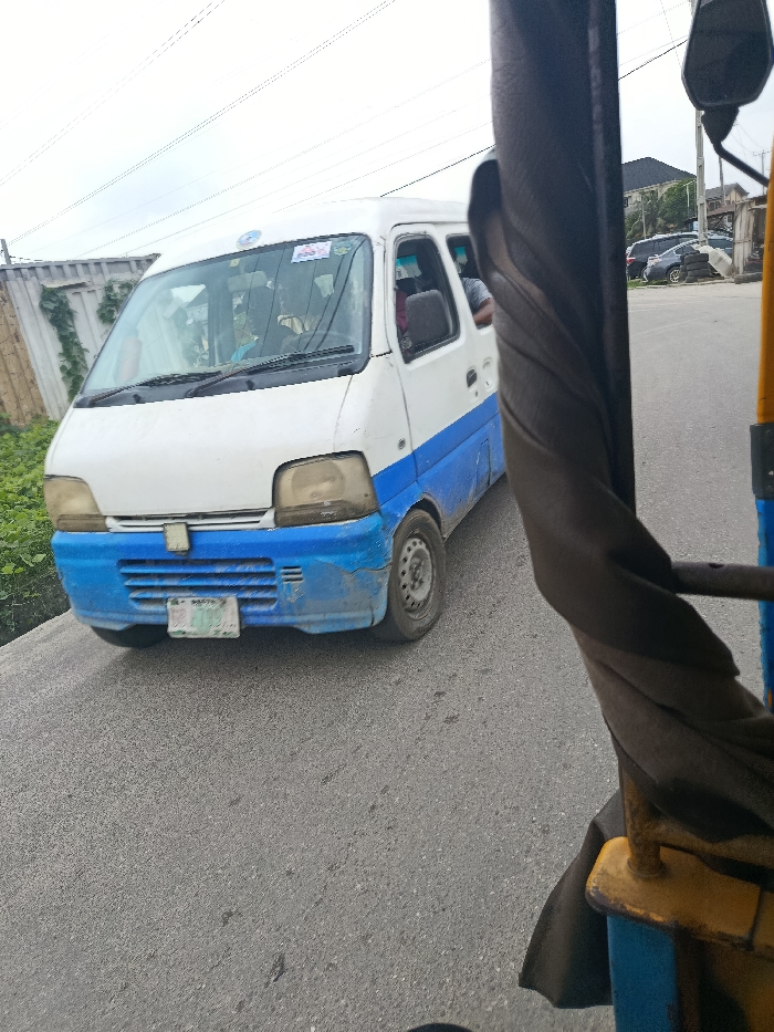 The image depicts an urban street scene in Warri, Nigeria, captured from a moving vehicle, likely a tricycle taxi (keke Napep), indicated by the partial view of a yellow and blue metal frame and dark fabric element in the right foreground. A white and blue Suzuki Every-style minivan, commonly referred to as a "korope" or "bus," occupies the central midground, moving on an asphalt road. Its top half is white, while the lower half, including the front bumper, is painted blue. The blue paint is faded, chipped, and exhibits dirt and mud splashes. The headlights appear aged. A Nigerian license plate, partially legible and containing "WARRI," is affixed to the front bumper. The driver is visible through the windshield, and multiple passengers are discernible inside, with one person's arm extending from an open rear window on the passenger side. To the left of the minivan, a weathered corrugated metal fence, partially obscured by green vines and foliage, defines a property boundary. Beyond this, dense green vegetation is visible. To the right, further down the road, a dark-colored vehicle is parked near a stack of tires. Behind these objects, a multi-story building with a dark roof and light-colored walls stands against the horizon. The sky is overcast, and utility lines are visible overhead. The road surface is dry asphalt.