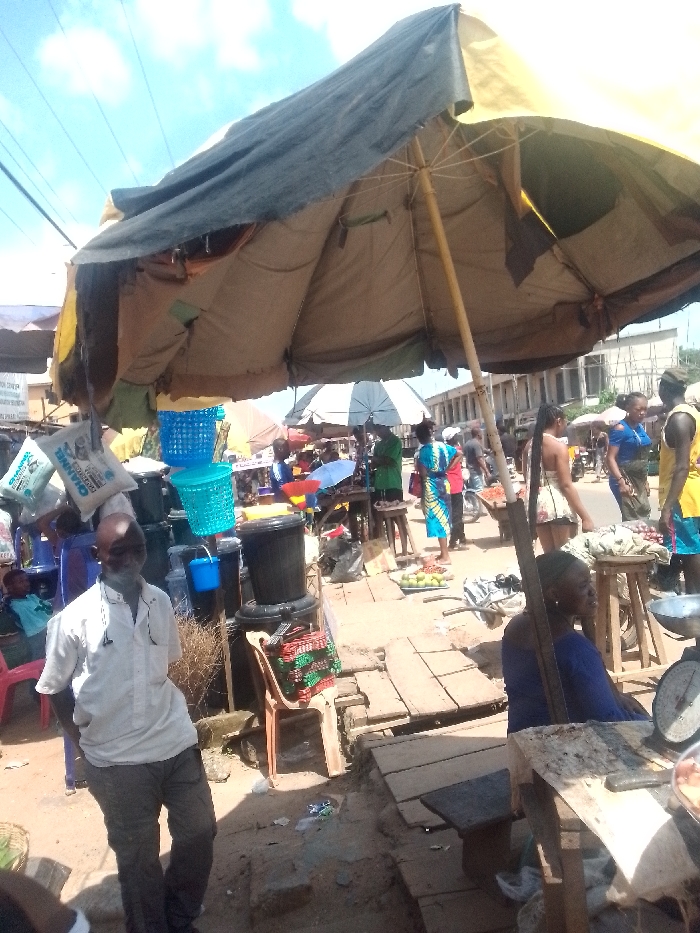 The scene depicts a bustling outdoor street market in Egbagu, Nigeria, under a bright, clear sky with visible utility lines. A large, weathered market umbrella with tan and dark grey fabric, supported by a wooden pole, dominates the foreground, casting shade. In the immediate foreground, to the left, a bald, adult male with a short beard, wearing a light-colored short-sleeved collared shirt and dark trousers, stands with eyeglasses hanging from his collar, looking towards the right. To the right, an adult female with dark skin, wearing a blue top, is seated behind a wooden table. A mechanical weighing scale with a circular dial and a silver pan rests on the table in front of her. Around these individuals, merchandise is openly displayed. Stacked plastic baskets and buckets, some blue and one black, are visible. White sacks, one labeled "CHANNEL," hang from a display. On the ground or low wooden structures, various produce is laid out, including green fruits (possibly limes) on a tray and red items (possibly tomatoes or other fruits) on a wooden stool. The ground is unpaved, uneven earth, with scattered debris and some makeshift wooden planks serving as walkways or platforms. Numerous other individuals, both vendors and customers, populate the midground and background, engaged in market activities. Figures include a person in a yellow top and blue shorts on the far right, and another in a patterned blue and red dress in the center-left midground. Beyond the market stalls, a street with visible vehicle traffic and multi-story buildings, some appearing aged or under construction with scaffolding, extends into the background.